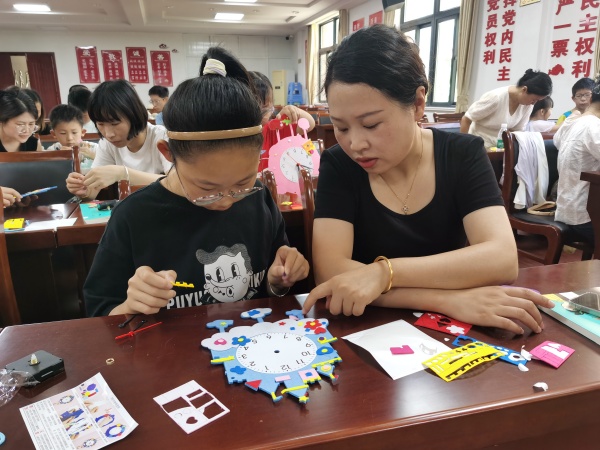 “我做的時(shí)鐘有個(gè)小太陽,希望每天都能充滿陽光!”“我的時(shí)鐘有好多星星,像夢幻的夜空。”6月28日,南通開發(fā)區(qū)竹行街道星怡社區(qū)黨群服務(wù)中心二樓校外輔導(dǎo)站活動(dòng)室里充滿歡聲笑語。