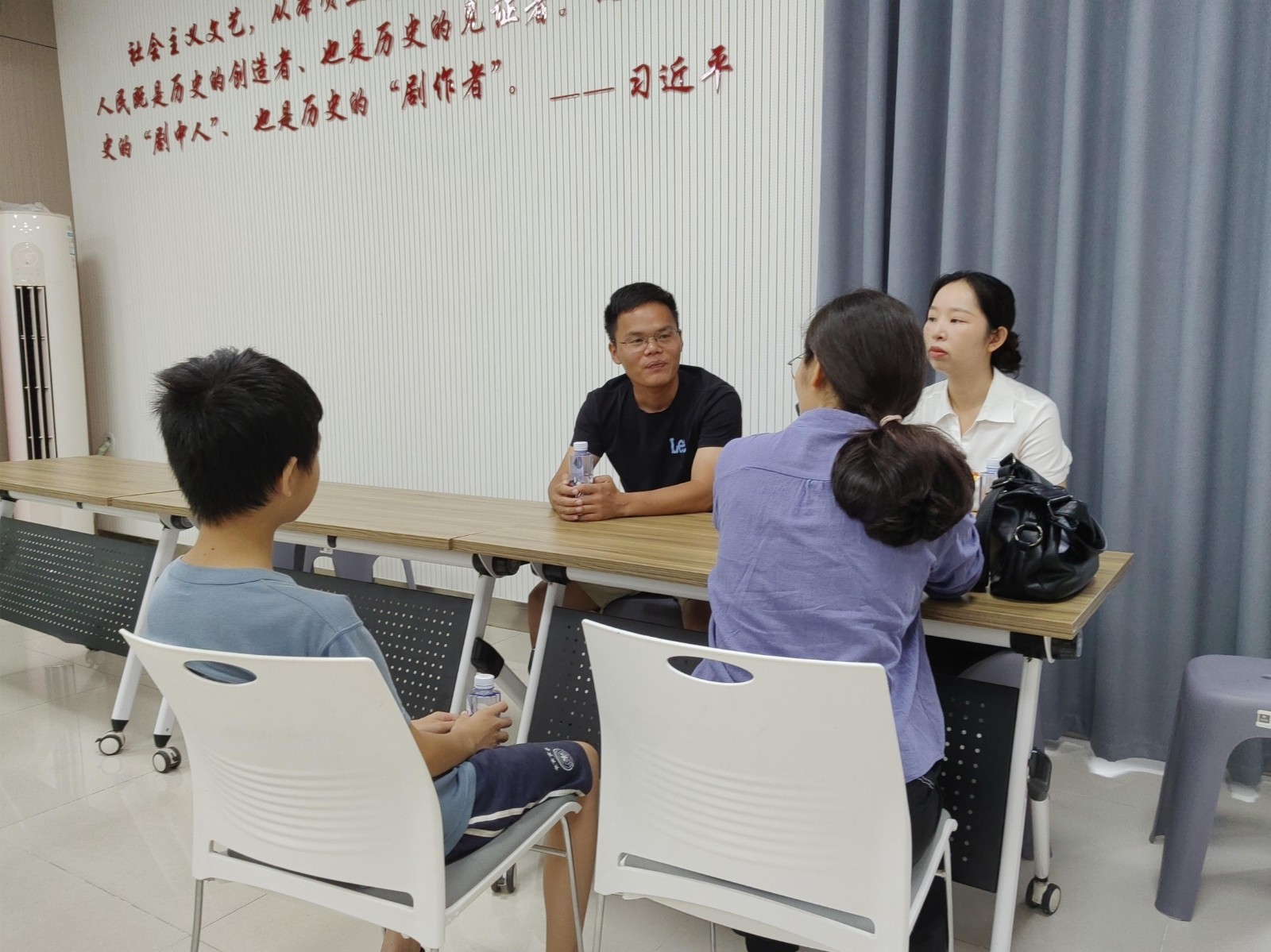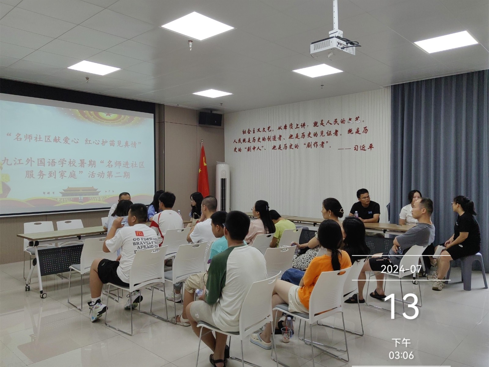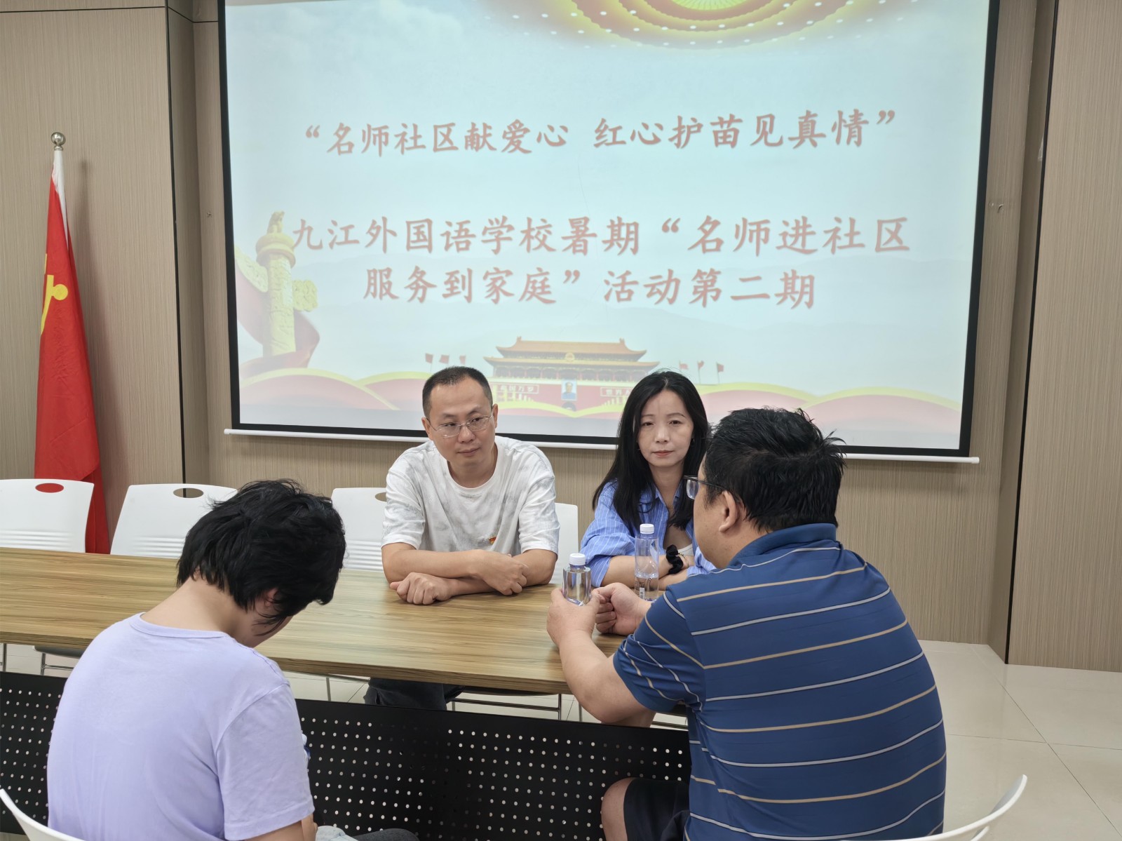 7月15日,九江外國語學校政教處主任代晴帶領(lǐng)優(yōu)秀教師趙文斌、饒琪、張細鵬老師頂著高溫酷暑,走進九江市八里湖新區(qū)畔湖社區(qū)開展“名師進社區(qū),服務到家庭”活動,與家長、學生們坐在一起,面對面?zhèn)鹘?jīng)授道,持續(xù)激發(fā)家校社協(xié)同育人新動能。這已經(jīng)是該校第二次到畔湖社區(qū)開展類似活動。