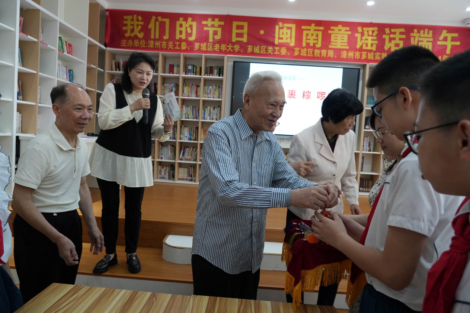 端午時(shí)節(jié)道安康,幸福美滿粽飄香,為進(jìn)一步在青少年中弘揚(yáng)和培養(yǎng)愛國主義為核心的民族精神,傳承中華優(yōu)秀傳統(tǒng)文化,唱響“我們的節(jié)日”主題。2024年6月7日上午,漳州市關(guān)工委、薌城區(qū)老年大學(xué)、薌城區(qū)關(guān)工委、薌城區(qū)教育局、漳州市薌城實(shí)驗(yàn)小學(xué)聯(lián)合舉辦“我們的節(jié)日·閩南童謠話端午”活動(dòng)。市關(guān)工委主任李天森、執(zhí)行主任周亞冷,區(qū)關(guān)工委主任馮愛珍、相關(guān)單位領(lǐng)導(dǎo)及薌城實(shí)小師生近50人參加此次活動(dòng)。