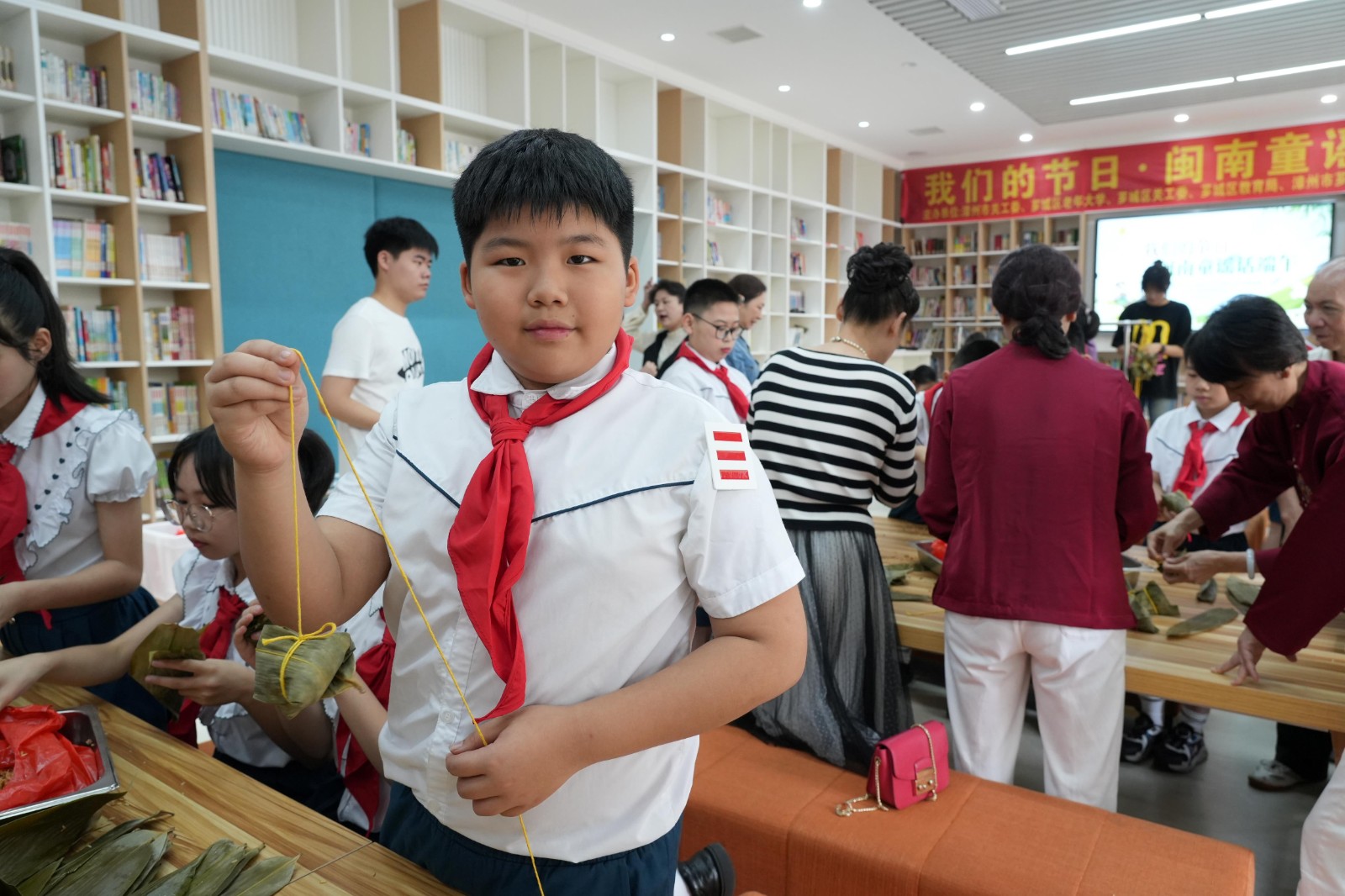 綠楊帶雨垂垂重,五色新絲纏角粽?;顒?dòng)最后,“五老”志愿者向同學(xué)們傳授包粽子技藝,同學(xué)們?cè)凇拔謇稀敝驹刚叩哪托闹笇?dǎo)下,操作從不熟練到找到門道,粽子從五花八門到有棱有角。空氣中彌漫著淡淡粽香,大家歡聲笑語,沉浸在節(jié)日的氛圍里。