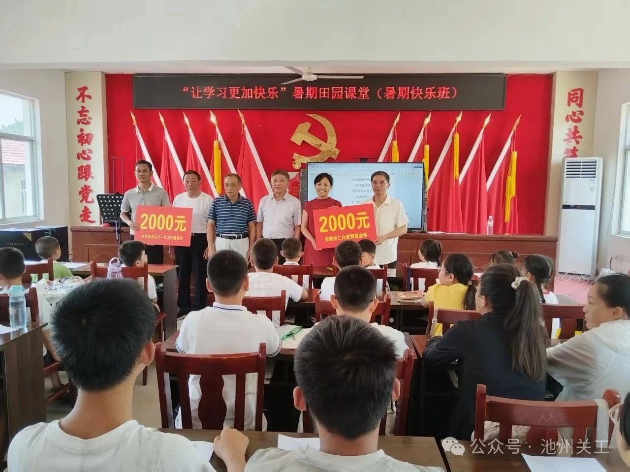7月18日,安徽省池州市關(guān)工委會同安徽省仁眾教育基金會先后到東至縣木塔鄉(xiāng)、官港鎮(zhèn)、張溪鎮(zhèn)、東流鎮(zhèn)等四處“暑期兒童快樂班”開展慰問捐贈活動,分別給予2000元資金支持。市關(guān)工委副主任黃高平參加活動。
