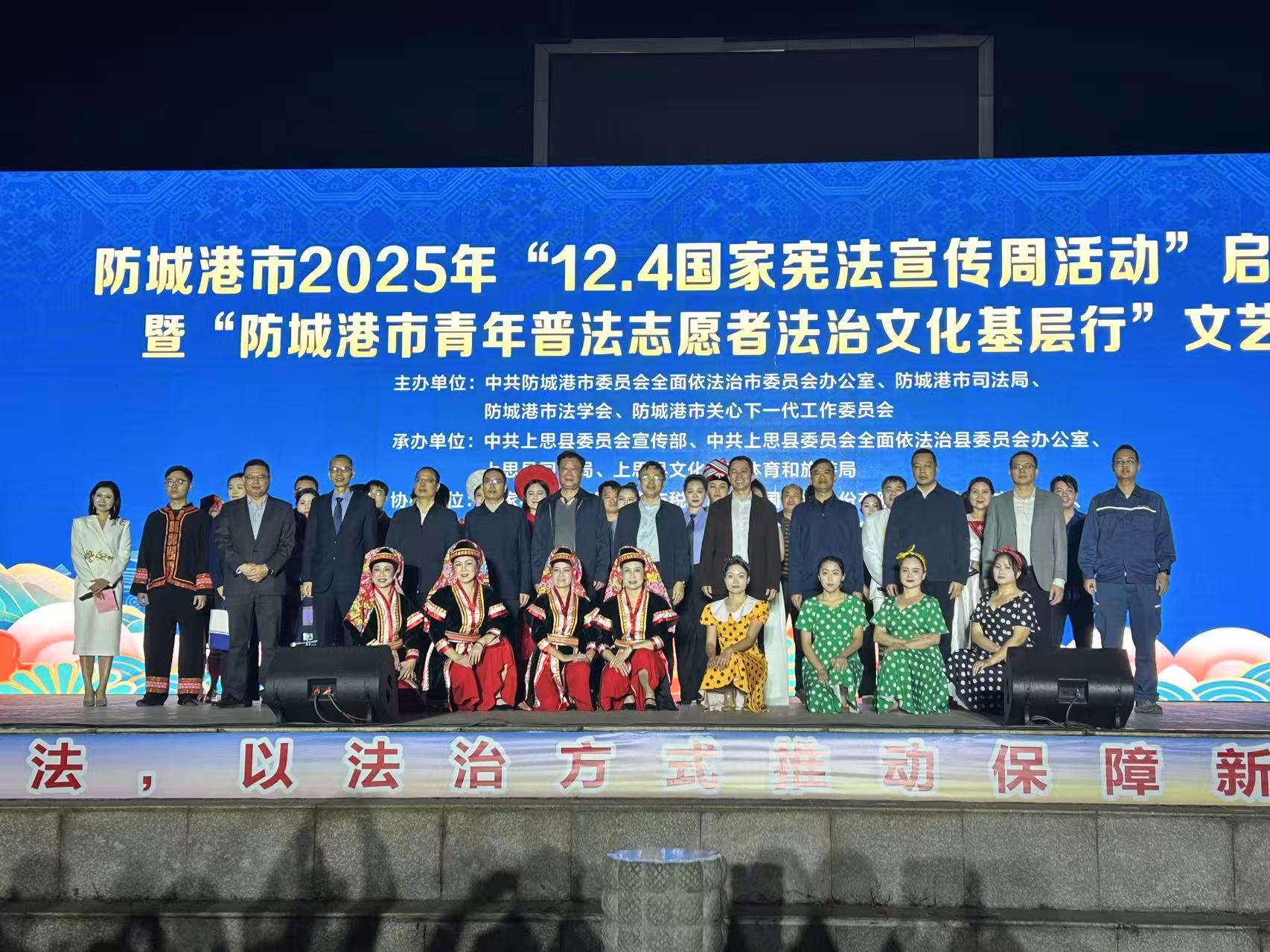 當天晚上,在上思縣明江公園廣場,市關工委聯(lián)合相關單位共同主辦防城港市2025年“12·4國家憲法宣傳周活動”啟動儀式暨“防城港市青年普法志愿者基層行”文藝匯演活動,近千名群眾到場觀看?;顒蝇F(xiàn)場,市關工委執(zhí)行主任倪耀中在晚會上宣讀《防城港市鄉(xiāng)村法治宣傳教育倡議書》,向廣大群眾發(fā)出學法守法的倡議;“五老”志愿者帶來朗誦節(jié)目《法治之光》,以真摯的情感與有力的表達禮贊2025全面依法治國工作會議精神;合唱節(jié)目《憲法之歌》則以激昂的旋律,展現(xiàn)了全社會共建法治社會的堅定決心。