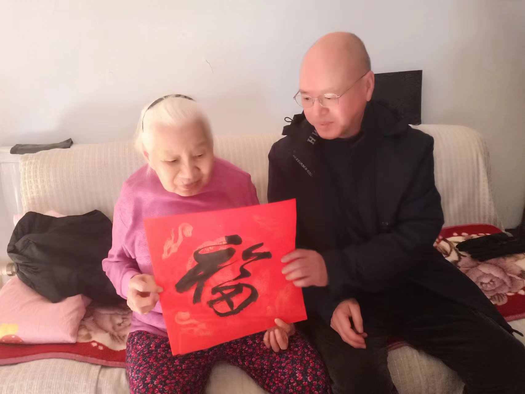 志愿者們還將“新鮮出爐”的春聯(lián)排列開(kāi)來(lái),整理晾干后送到職工及獨(dú)居老人的手中,拿到心儀春聯(lián)的“五老”及職工群眾們喜悅之情溢于言表,紛紛表示,“手寫春聯(lián)比印制春聯(lián)更有溫度、更有意義!”