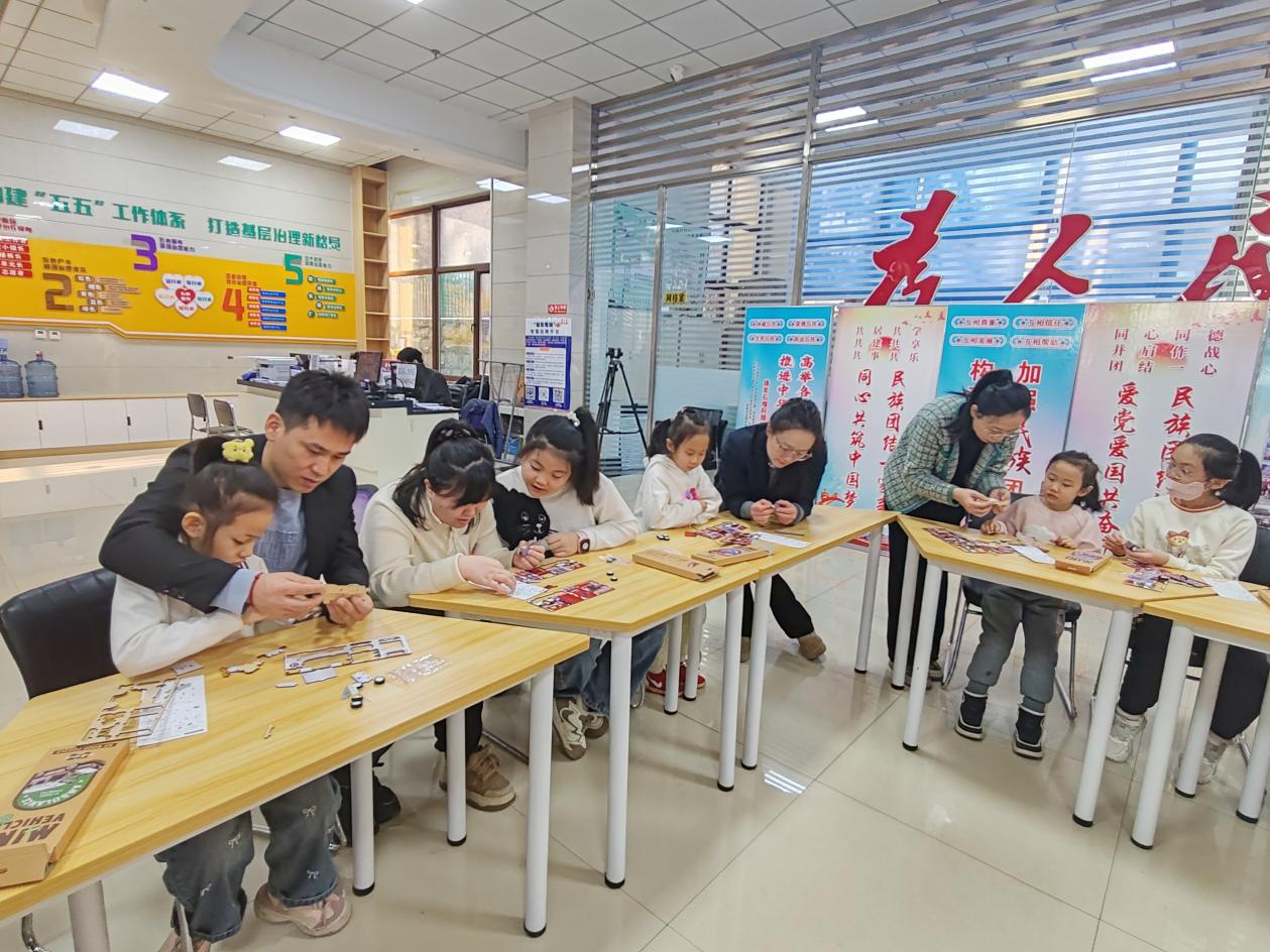 隨后,社區(qū)工作人員為每位小朋友發(fā)放了消防車立體拼圖材料包,詳細(xì)講解了拼圖的制作步驟、拼接技巧及安全注意事項,志愿者們還進(jìn)行了現(xiàn)場示范。拿到材料包后,孩子們立刻投入到拼圖創(chuàng)作中,有的認(rèn)真觀察圖紙、仔細(xì)比對零件,有的小心翼翼地拼接組裝,遇到難題時主動向工作人員或身邊同伴求助。工作人員與志愿者們穿梭在孩子們中間,耐心指導(dǎo)操作技巧,及時解答疑問,鼓勵孩子們大膽嘗試、互幫互助。在大家的共同努力下,一個個零散的拼圖零件逐漸組裝成形態(tài)逼真的消防車模型,孩子們捧著自己親手完成的作品,臉上滿是成就感與喜悅。