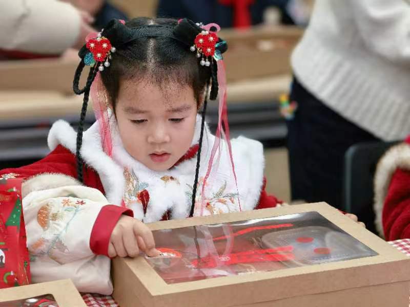 學(xué)唱《臘八歌》時(shí),稚嫩的歌聲洋溢著節(jié)日的喜悅,孩子們用天真爛漫的方式表達(dá)對傳統(tǒng)節(jié)日的理解。在關(guān)工委志愿者耐心指導(dǎo)下,孩子們親手將臘八粥食材裝入牛皮紙盒,貼上“?!弊仲N,再將新春對聯(lián)、臺歷等精心組合,制作成蘊(yùn)含祝福的“暖心臘八禮盒”。這一動手實(shí)踐環(huán)節(jié),讓孩子們在感知文化魅力的同時(shí),也培養(yǎng)了動手能力與創(chuàng)造力,在歡聲笑語中播撒下傳統(tǒng)文化的種子。