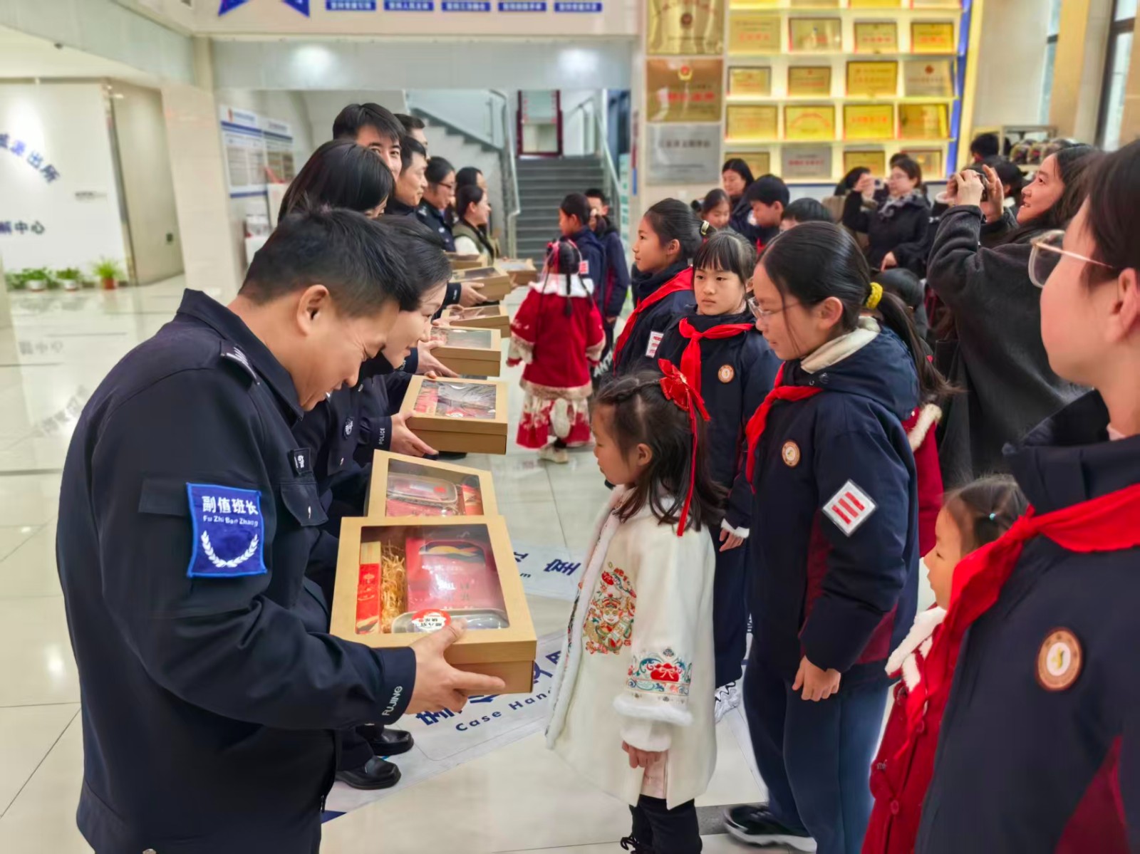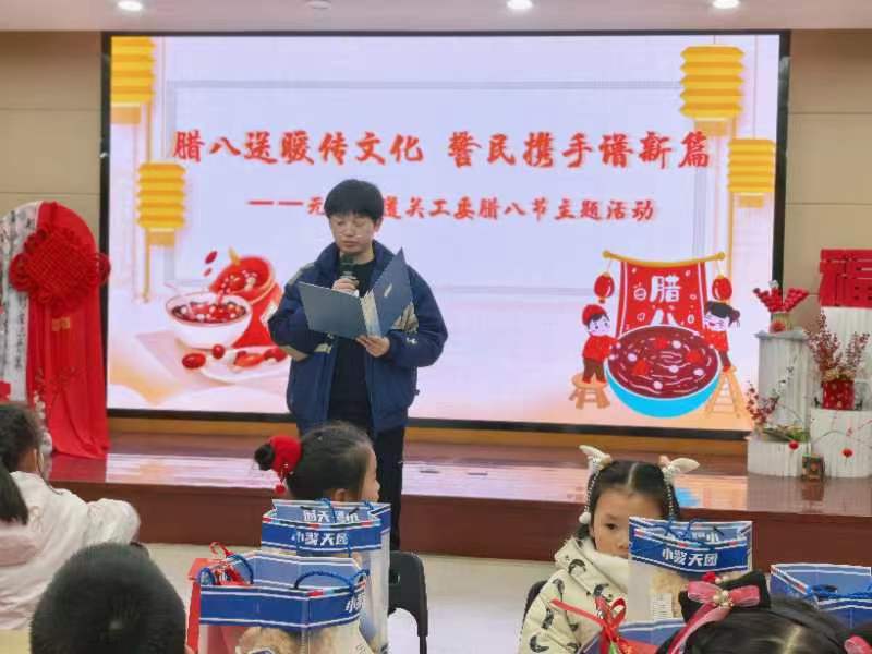 下午14時(shí),街道關(guān)工委負(fù)責(zé)人、社區(qū)關(guān)工委志愿者、御窯小學(xué)及御窯幼兒園師生代表帶著精心制作的“暖心臘八禮盒”,走進(jìn)中心商貿(mào)城派出所,向平安守護(hù)者致以真摯感謝。