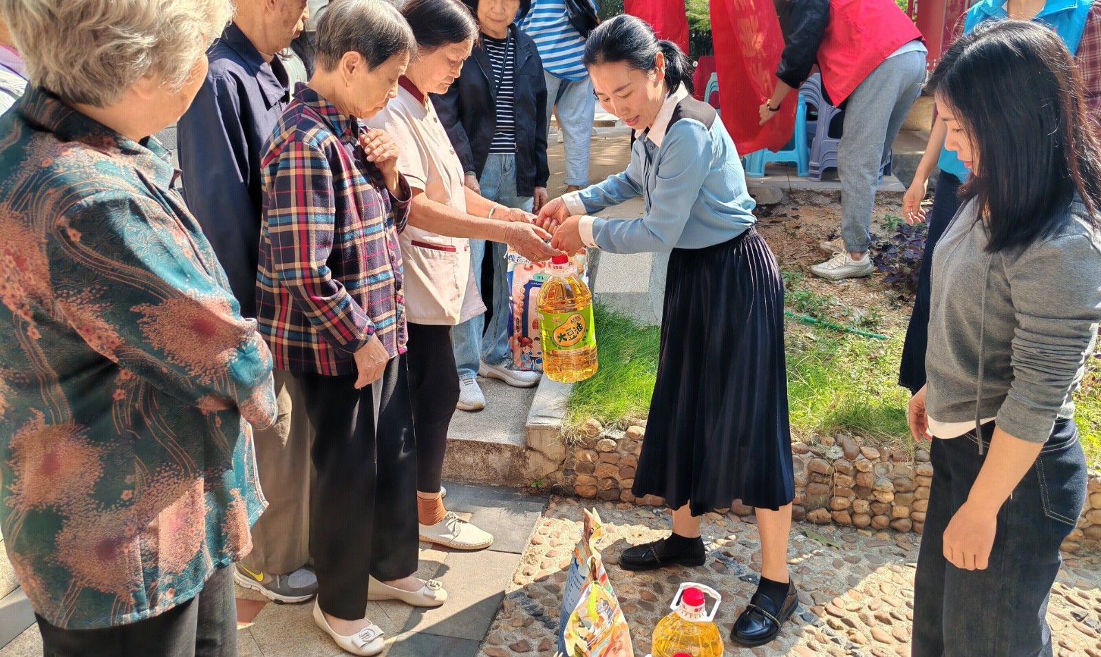 活動現(xiàn)場,社區(qū)工作人員為轄區(qū)老人送上節(jié)日祝福,與他們親切交談、噓寒問暖,詳細(xì)詢問最近健康狀況,生活需求以及遇到的困難。并給大家發(fā)放大米、食用油等慰問品,切實(shí)把溫暖送到了他們的手中,讓大家真正感受到社區(qū)大家庭的溫暖。隨后,醫(yī)護(hù)人員為老人們測量血壓,囑咐要注意飲食,保持良好的生活飲食習(xí)慣。最后,社區(qū)工作人員還上門走訪慰問百歲老人,聊家常、問冷暖,為他們送上慰問品,并致以節(jié)日的問候和祝福。