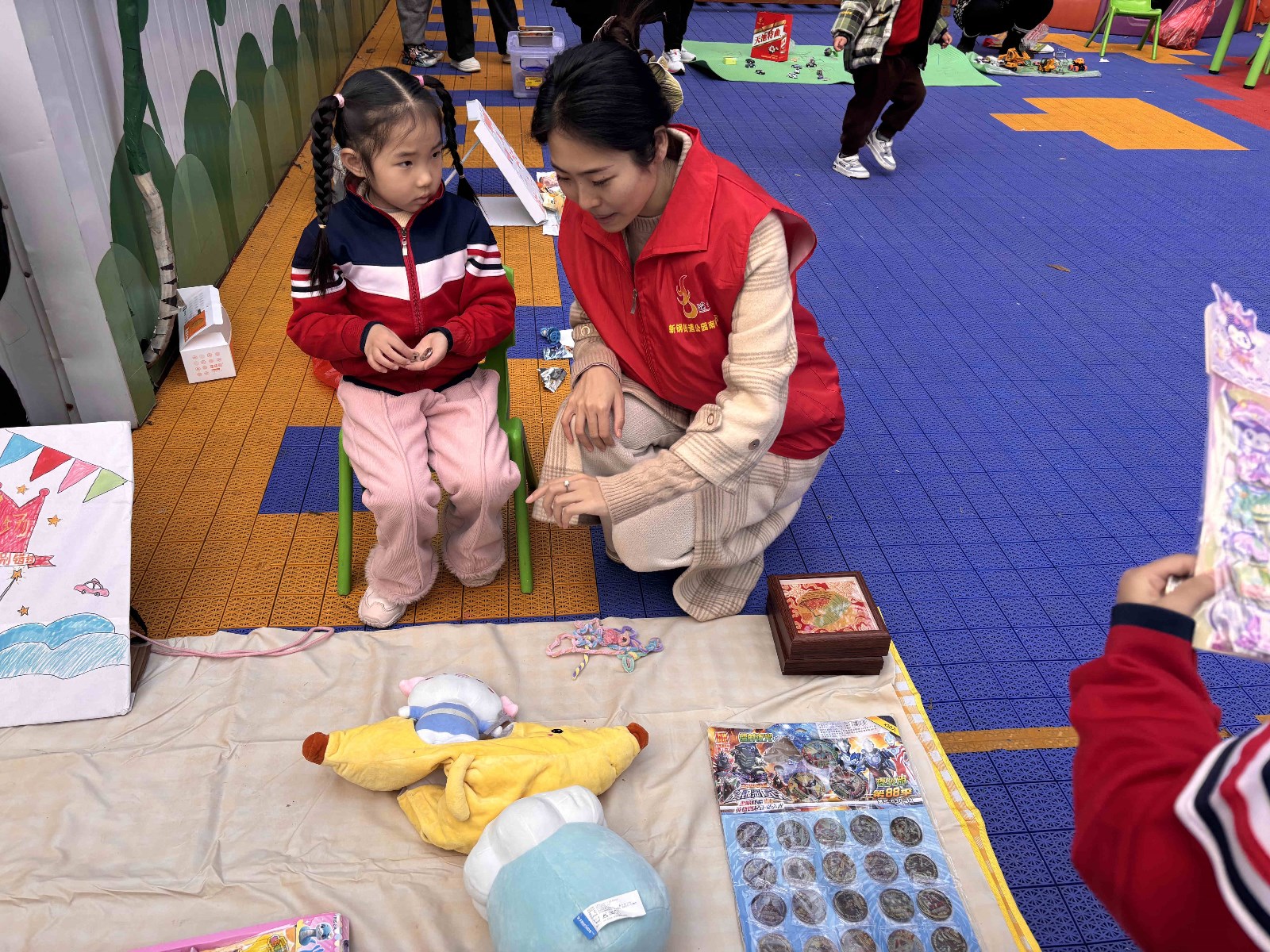 活動開場,孩子們身著統(tǒng)一園服,敲起紅鼓、舞動彩龍,以鮮活的民俗表演點燃現(xiàn)場氛圍;隨后的親子跳蚤市集里,數(shù)十組家庭支起攤位,玩具、繪本、手工作品整齊陳列,孩子們化身“小掌柜”,在討價還價、物品交換中學會分享與節(jié)約。社區(qū)“敲門嫂”志愿者也現(xiàn)場引導,協(xié)助小攤位規(guī)范擺放,讓市集既熱鬧又有序。
