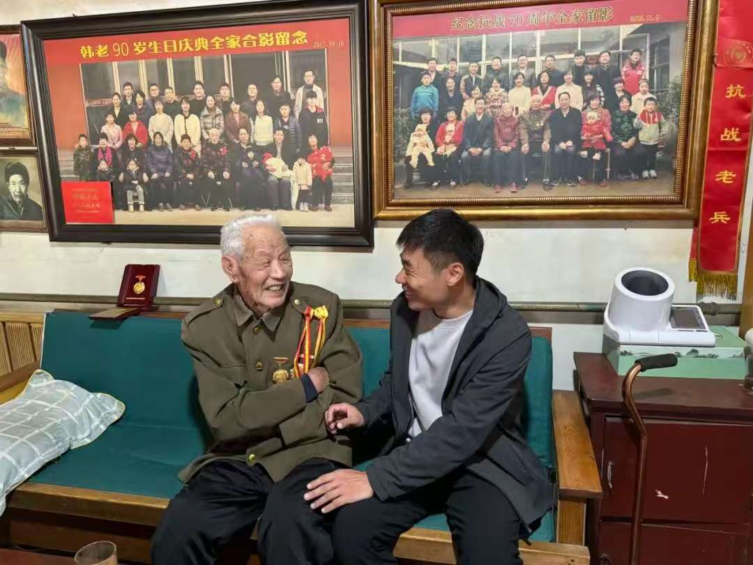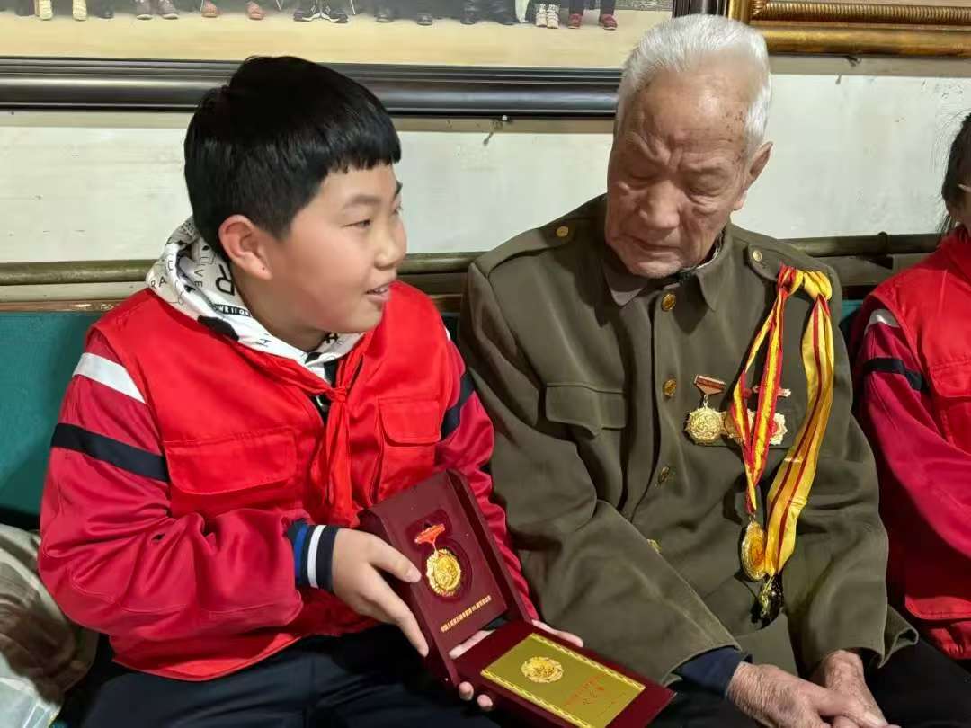 重陽節(jié)當(dāng)天,在劉校長的帶領(lǐng)下,少先隊輔導(dǎo)員張老師和少先隊員代表,帶著精心準(zhǔn)備的慰問品和節(jié)日祝福,來到老兵家中。得知師生們前來,98歲的韓爺爺特意換上整潔的衣物,胸前的三枚榮譽勛章在陽光下熠熠生輝。
