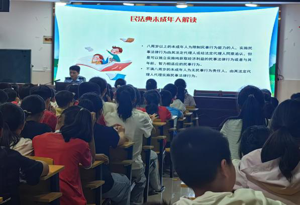 宣講中,黃警官系統(tǒng)講解民法典相關知識。“走進民法典知識講座”,介紹了民法典的編纂歷程和重要意義;“為什么要學習民法典”,結(jié)合社會熱點闡述了法律學習的重要性; “民法典未成年人解讀”,重點解析了與青少年權(quán)益保護相關條款;“日常生活中的民法典”,通過典型案例展示了法律與日常生活的密切聯(lián)系。