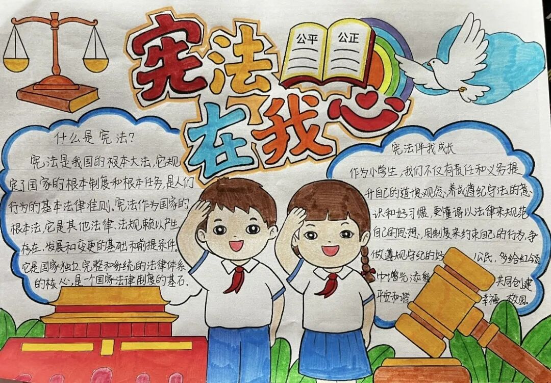 憲法主題班會(huì)上,各班班主任化身“法治導(dǎo)師”,圍繞“憲法是什么”“憲法與我們的生活”等話題展開(kāi)教學(xué)。低年級(jí)班級(jí)通過(guò)動(dòng)畫短片等形式,將抽象的法律條文轉(zhuǎn)化為生動(dòng)的故事,讓孩子們明白憲法是保護(hù)大家的“護(hù)身符”;中高年級(jí)則結(jié)合校園欺凌、交通安全等案例,組織小組討論“如何用法律保護(hù)自己”,同學(xué)們積極發(fā)言,分享自己對(duì)法治的理解。