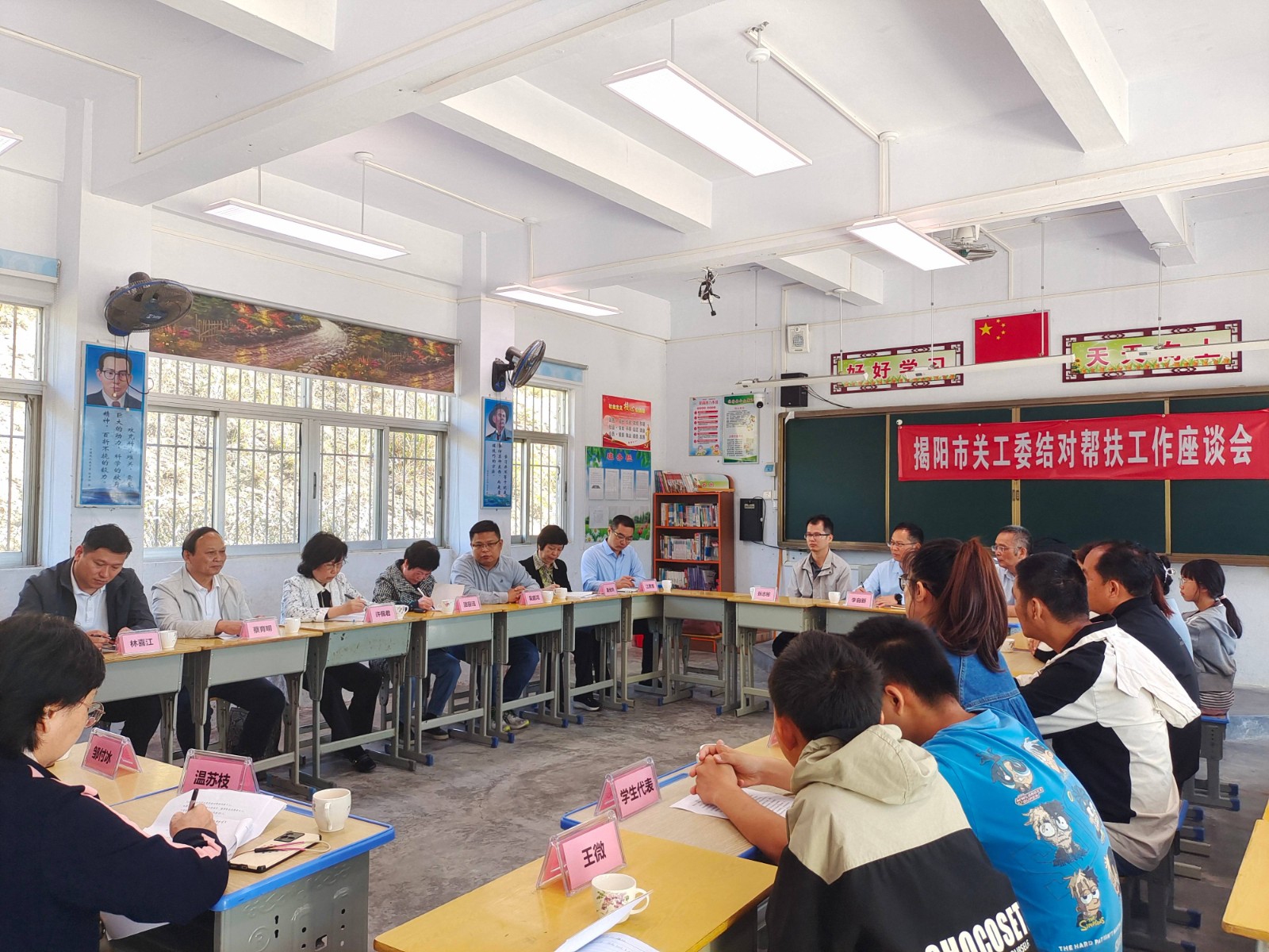 結(jié)對(duì)幫扶工作座談會(huì)由揭西縣關(guān)工委副主任黃振勇主持。揭西縣關(guān)工委主任蔡育明,揭西縣委組織部副部長(zhǎng)、縣委老干部局局長(zhǎng)林喜江,五經(jīng)富鎮(zhèn)委副書記、鎮(zhèn)長(zhǎng)吳庭鴻等參加座談會(huì)。