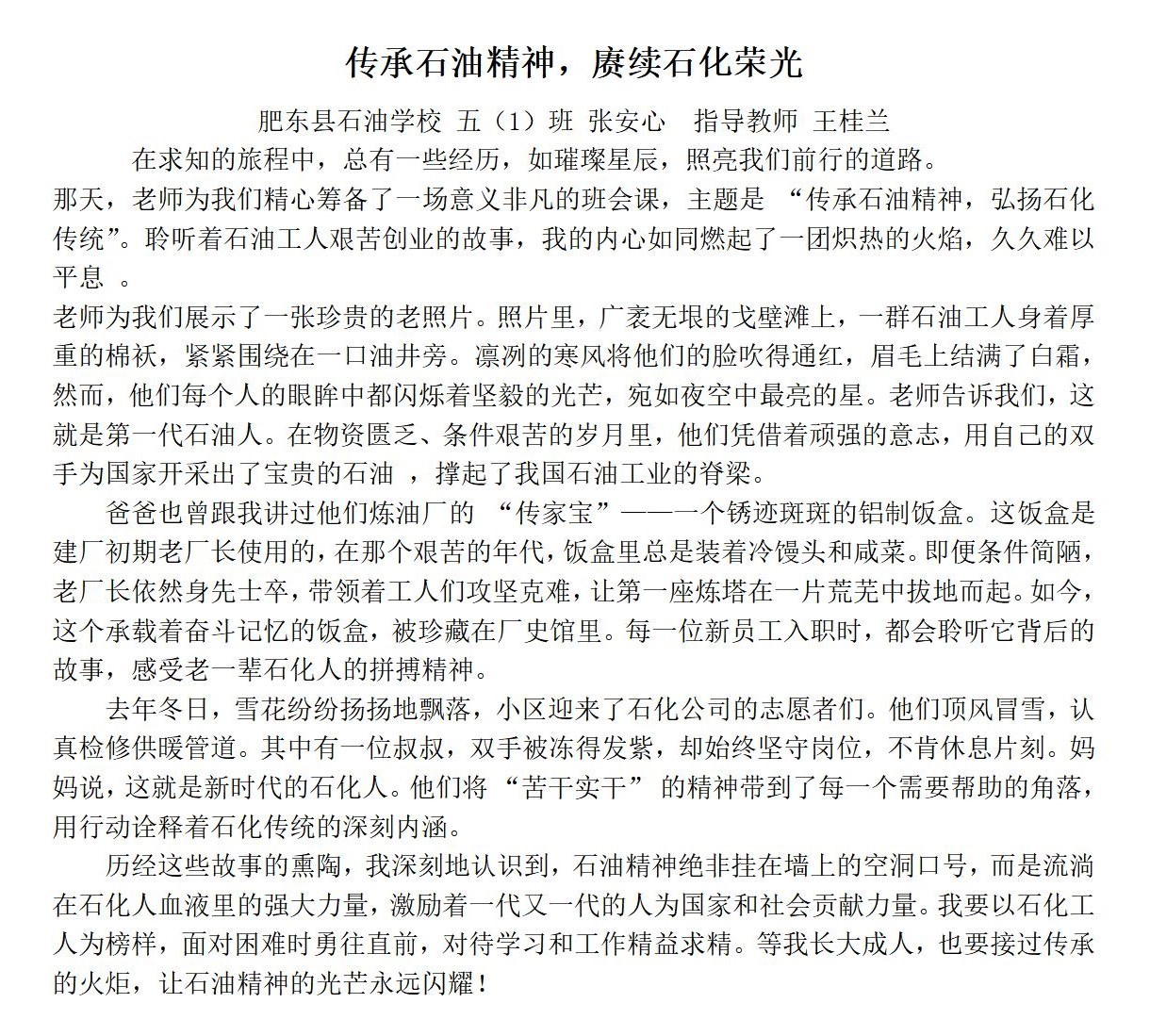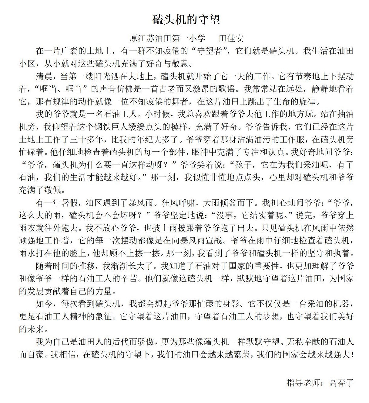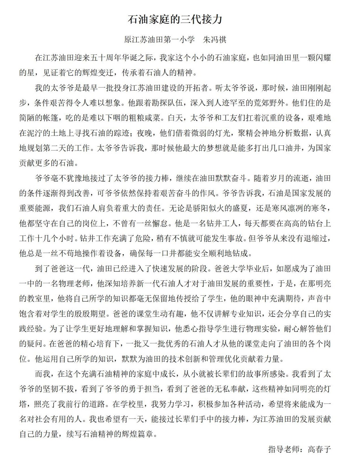 本次活動自啟動以來,得到了眾多“油二代”“油三代”以及受“油文化”熏陶的油區(qū)青少年積極響應(yīng)和廣泛參與。經(jīng)過一個多月的精心準備和創(chuàng)作,共征集到作文34篇,繪畫作品35篇。這些作品主題鮮明,內(nèi)容豐富,形式多樣,充分展現(xiàn)了油區(qū)青少年對江蘇油田發(fā)展歷程的深刻理解和對石油精神的獨特感悟。