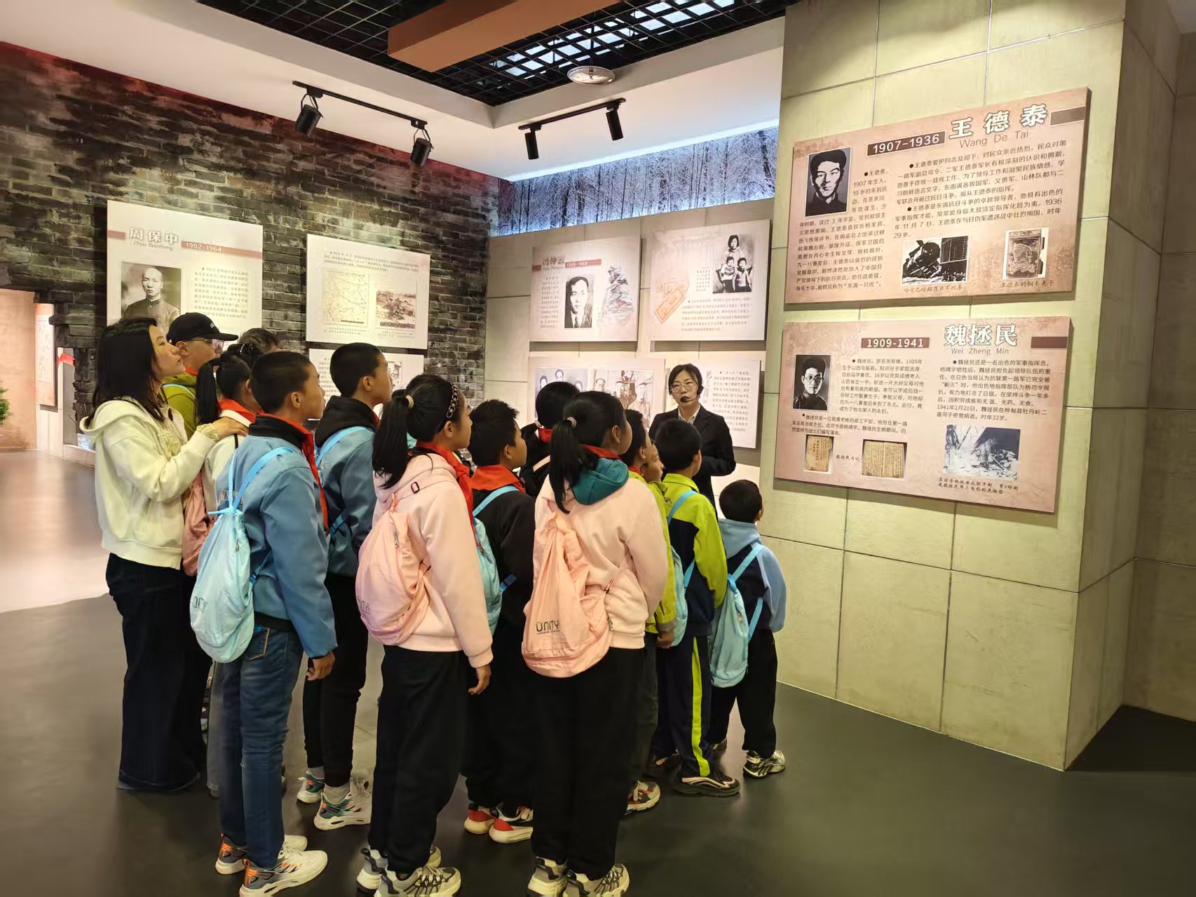活動當日,孩子們懷著崇敬與期待的心情踏入東北抗聯(lián)事跡館?!坝赂皣y、根植人民、巨艱萬難、殊死鏖戰(zhàn)、大義獻身、忠魂常留”6個展廳,以逼真的場景再現(xiàn)了東北抗聯(lián)14年艱苦卓絕的抗日斗爭歷史。孩子們通過實物、視頻、圖片、展板以及工作人員講解,了解趙尚志、楊靖宇、趙一曼等英雄的事跡,重溫那段戰(zhàn)火硝煙的歲月,感受老一輩革命家不忘初心、矢志不渝的革命精神。每一個鮮活的人物形象,每一幅珍貴的歷史圖片、每一件承載歲月記憶的革命文物、每一段震撼人心的戰(zhàn)斗故事,都令孩子們?yōu)橹畡尤?,低頭沉思間強忍淚花,抬頭仰望時心潮澎湃。