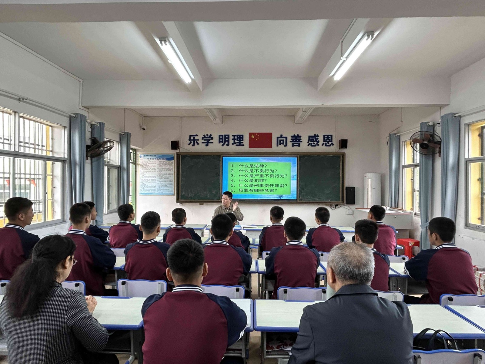 隨后,市關(guān)工委“五老”法治宣講團(tuán)成員、退休檢察官梁恪嘉為全校師生帶來(lái)法治教育課。課堂上,他結(jié)合自身多年司法工作經(jīng)歷,以青少年容易接觸到的不良行為、網(wǎng)絡(luò)交友、權(quán)益保護(hù)等實(shí)際場(chǎng)景為切入點(diǎn),用一個(gè)個(gè)真實(shí)、鮮活的案例,圍繞“犯罪離我們有多遠(yuǎn)”“我的未來(lái)不是夢(mèng)”兩個(gè)方面,深入淺出地告訴同學(xué)們“什么能做、什么不能做?!薄笆裁词遣涣夹袨??”“犯罪有哪些危害?”通過(guò)提問(wèn)互動(dòng)的方式,引導(dǎo)同學(xué)們主動(dòng)思考、積極發(fā)言,現(xiàn)場(chǎng)氣氛熱烈。