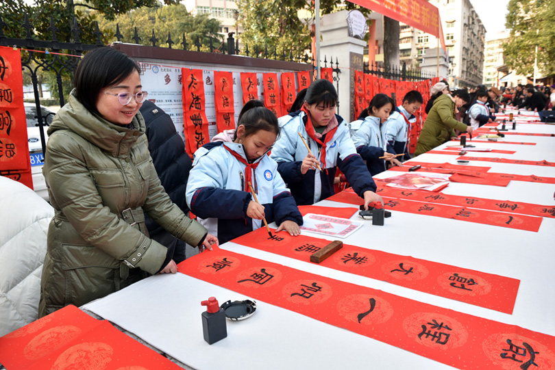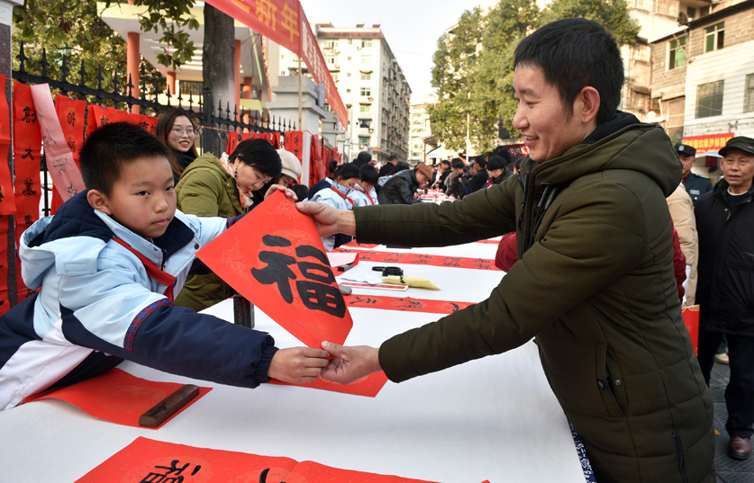 在活動(dòng)中,學(xué)校愛(ài)好書(shū)法的師生先后來(lái)到石家沖街道榮昌社區(qū)、乾州街道小溪橋社區(qū),現(xiàn)場(chǎng)揮毫潑墨,鋪紙研墨。學(xué)生們也毫不遜色,一停一頓、一筆一畫(huà)間,儼然一派“小書(shū)法家”風(fēng)范,將一副副春聯(lián)和“?!弊终宫F(xiàn)在大家眼前,讓在場(chǎng)的市民都為他們豎起了大拇指,紛紛挑選自己心儀的春聯(lián)?!靶?shū)法家”許新月看到自己親手寫(xiě)的春聯(lián)這么受歡迎,高興地說(shuō),參加這次活動(dòng),讓我體會(huì)到傳統(tǒng)文化帶來(lái)的樂(lè)趣。據(jù)介紹,活動(dòng)共送出春聯(lián)“福”字1000余副。
