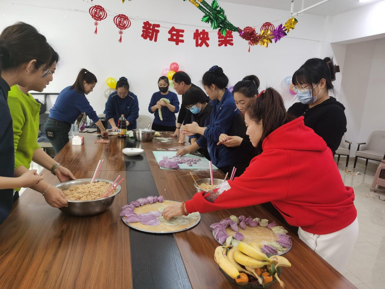 表演結(jié)束后,大家各自分工,一起動(dòng)手包餃子。有的挽起袖子和面、搟皮,有的負(fù)責(zé)洗菜、切菜、拌餡,忙得不亦樂乎?,F(xiàn)場大家有說有笑,其樂融融。很快,一個(gè)個(gè)飽含著幸福和溫暖的餃子展現(xiàn)在大家眼前?;顒?dòng)現(xiàn)場被濃濃的“年味”與溫情包裹著。一個(gè)多小時(shí)后,在大家的努力合作下,桌上堆滿了五彩餃子,喜悅之情溢于言表。