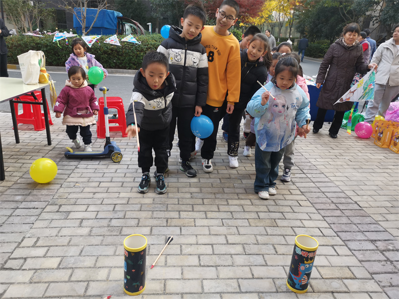 緊接著,孩子們?cè)凇坝螛?lè)場(chǎng)”里選擇自己喜歡的游戲盡情玩耍。看!有孩子們非常喜歡的投壺,他們手拿羽毛箭、屏氣凝神、瞄準(zhǔn)劍壺,專注地投壺。每次投中,活動(dòng)現(xiàn)場(chǎng)都會(huì)傳出一陣陣的歡呼聲、喝彩聲。還有深受小朋友們喜愛(ài)的團(tuán)體游戲“愛(ài)的傳遞”,孩子們既要追求速度,又要講究人與人的團(tuán)結(jié)與默契,相互合作奔向終點(diǎn)。家長(zhǎng)們?cè)谂赃厼楹⒆觽兗佑秃炔剩⒆觽兺娴貌灰鄻?lè)乎,臉上的笑容成為了現(xiàn)場(chǎng)最亮麗的風(fēng)景。