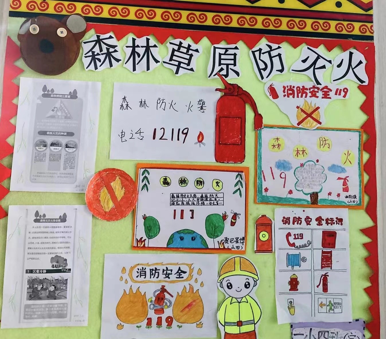 活動中各班老師根據(jù)幼兒的年齡特點,通過圖片、視頻、兒歌、班級森林防火主題墻(環(huán)創(chuàng))、班級森林草原防滅火主題活動課、幼兒以“森林草原防滅火”為主題進行國旗下的演講、開展幼兒繪畫活動等方式,生動形象地向幼兒講解森林防火及逃生知識。在豐富多彩的活動中孩子們懂得了森林防火的重要性,提高了幼兒對森林防火的安全意識和防護能力。