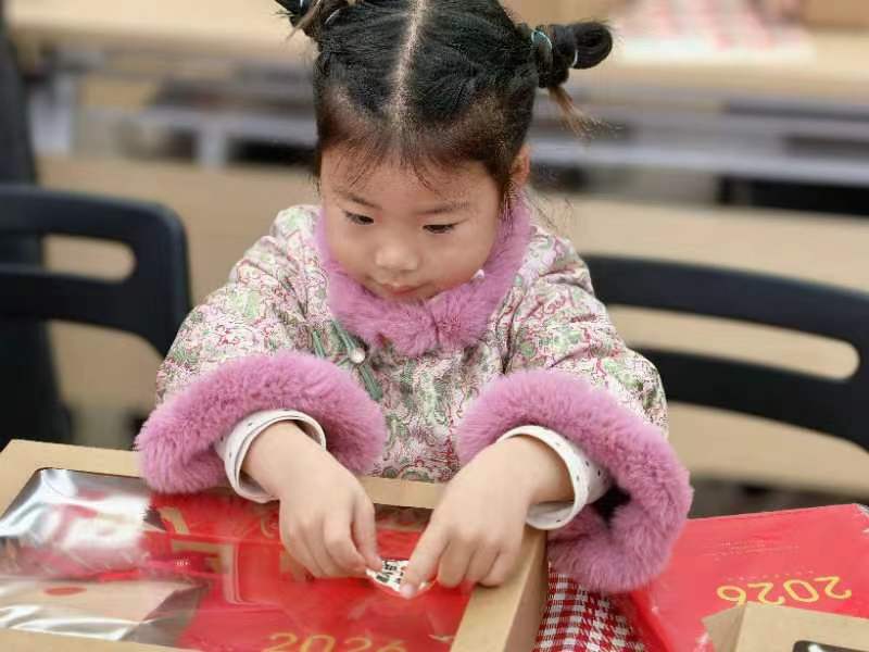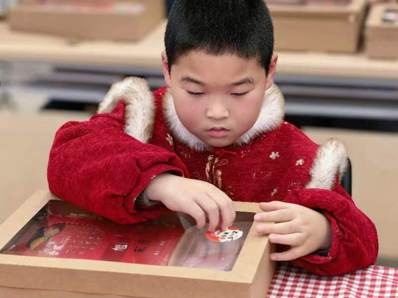 學(xué)唱《臘八歌》時(shí),稚嫩的歌聲洋溢著節(jié)日的喜悅,孩子們用天真爛漫的方式表達(dá)對傳統(tǒng)節(jié)日的理解。在關(guān)工委志愿者耐心指導(dǎo)下,孩子們親手將臘八粥食材裝入牛皮紙盒,貼上“?!弊仲N,再將新春對聯(lián)、臺歷等精心組合,制作成蘊(yùn)含祝福的“暖心臘八禮盒”。這一動手實(shí)踐環(huán)節(jié),讓孩子們在感知文化魅力的同時(shí),也培養(yǎng)了動手能力與創(chuàng)造力,在歡聲笑語中播撒下傳統(tǒng)文化的種子。