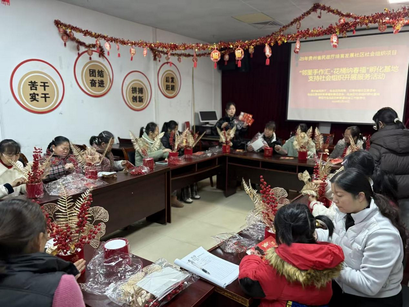 為豐富易地扶貧搬遷社區(qū)居民精神文化生活,營造喜慶祥和的新春節(jié)日氛圍,增強社區(qū)凝聚力與歸屬感,1月30日,貴州省貴陽市烏當區(qū)東風(fēng)鎮(zhèn)云錦尚城易地扶貧搬遷社區(qū)依托省民政廳培育發(fā)展社區(qū)社會組織項目支持,舉辦“鄰里手作匯、花桶納春?!毙麓耗晗ㄖ谱髦黝}活動,吸引了社區(qū)40余名孩子與家長及居民參加。