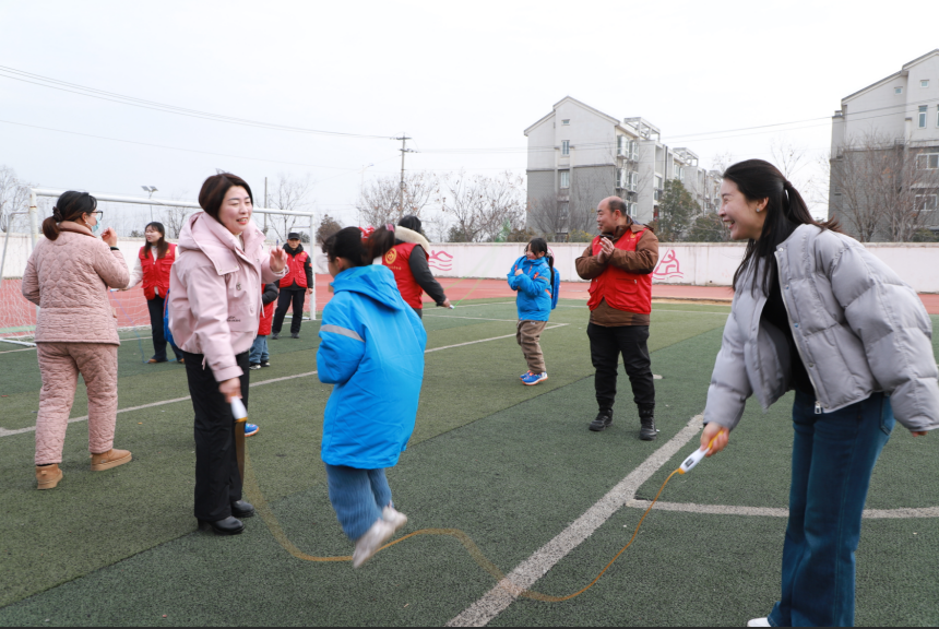 溫情不止于物質(zhì)幫扶,更在于心靈的陪伴。發(fā)放完“溫暖包”后,領(lǐng)導(dǎo)和志愿者們化身“大朋友”,與孩子們一同在室外開展跳繩、踢毽子等趣味運動。歡聲笑語驅(qū)散了冬日的寒冷,親密互動拉近了心與心的距離,孩子們在盡情享受運動樂趣的同時,也深深感受到了家人般的關(guān)愛與溫暖,校園里處處洋溢著溫馨和諧的濃厚氛圍。