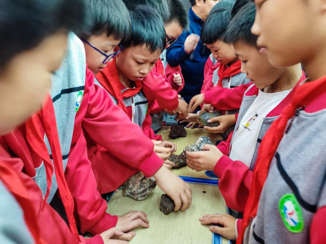 講座中,胡教授展示了南極冰川、珠穆朗瑪峰、大洋中奇特的巖石及其形成的原因;講述了形成化石的歷程,礦石的種類與巖石的區(qū)別;描繪了隕石的發(fā)現(xiàn)過程及研究隕石的重要意義,并通過展示形態(tài)各異、色彩斑斕的石頭樣本,讓孩子們領(lǐng)略到石頭的多樣性和美麗。胡健民教授在講座最后還增加了互動環(huán)節(jié)。講座結(jié)束后,同學(xué)們爭相和胡教授合影。