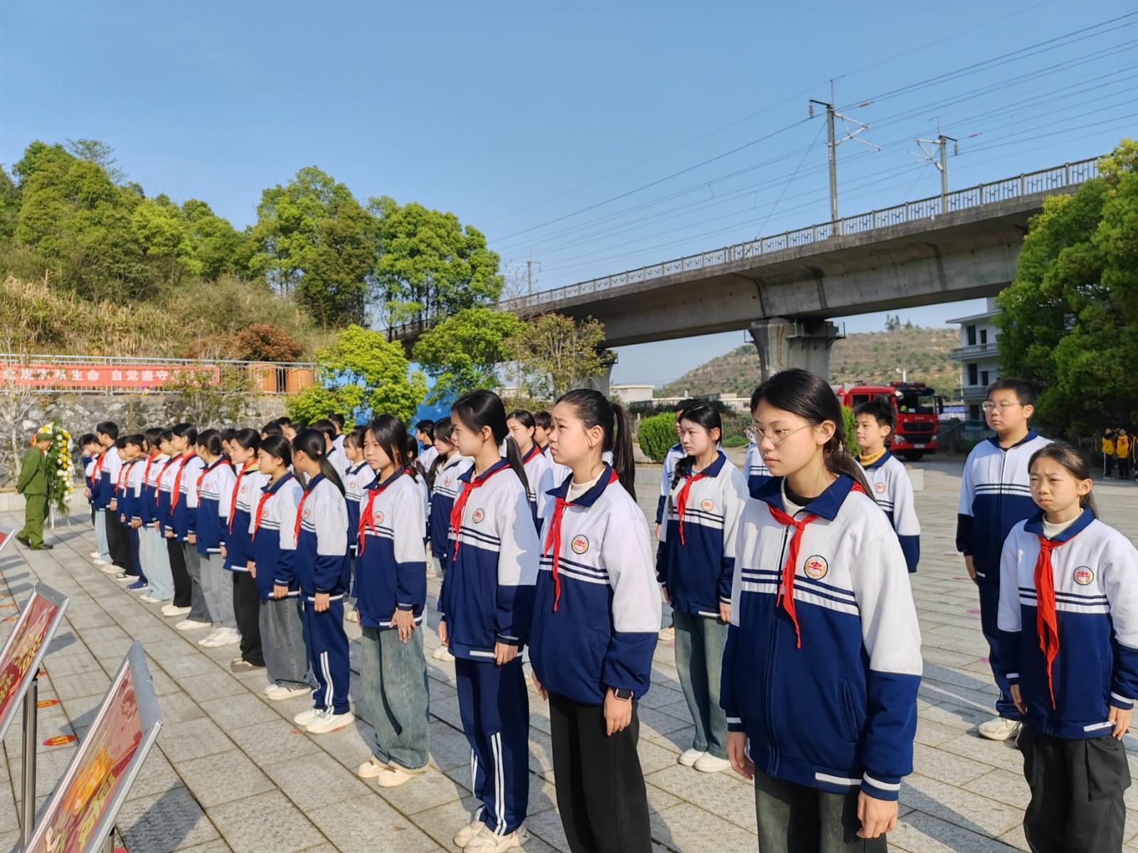 《義勇軍進(jìn)行曲》的激昂旋律在陵園上空奏響,師生們懷著無比崇敬的心情齊聲高唱,以歌聲向革命先烈致以最崇高的敬意。全體師生排列整齊,面向紀(jì)念碑低頭默哀。哀樂在陵園中低回,寄托著師生們對革命先烈的無盡追思。在這短暫的一分鐘里,同學(xué)們深刻感受到革命先烈為民族獨(dú)立、人民解放事業(yè)不惜拋頭顱、灑熱血的大無畏精神。
