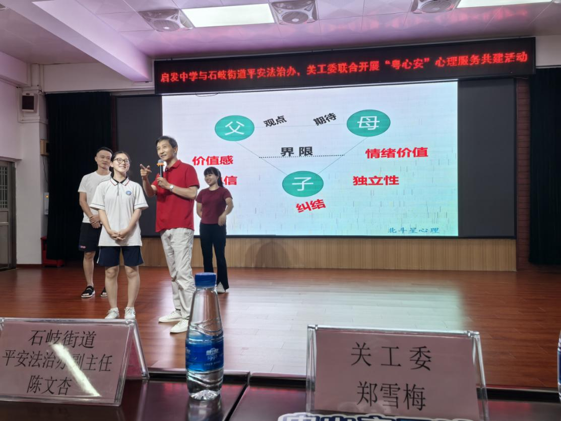 為讓家長(zhǎng)們更深入地了解青春期孩子的身心發(fā)展特點(diǎn),掌握科學(xué)有效的家庭教育方法,9月17日晚,中山市石岐街道關(guān)工委聯(lián)合街道平安法治辦在啟發(fā)中學(xué)開(kāi)展“粵心安”心理服務(wù)共建活動(dòng),來(lái)自街道關(guān)工委委員鄭雪梅、街道平安法治辦副主任陳文杏等相關(guān)負(fù)責(zé)人、啟發(fā)中學(xué)200多名初二教師和家長(zhǎng)代表參加活動(dòng)。